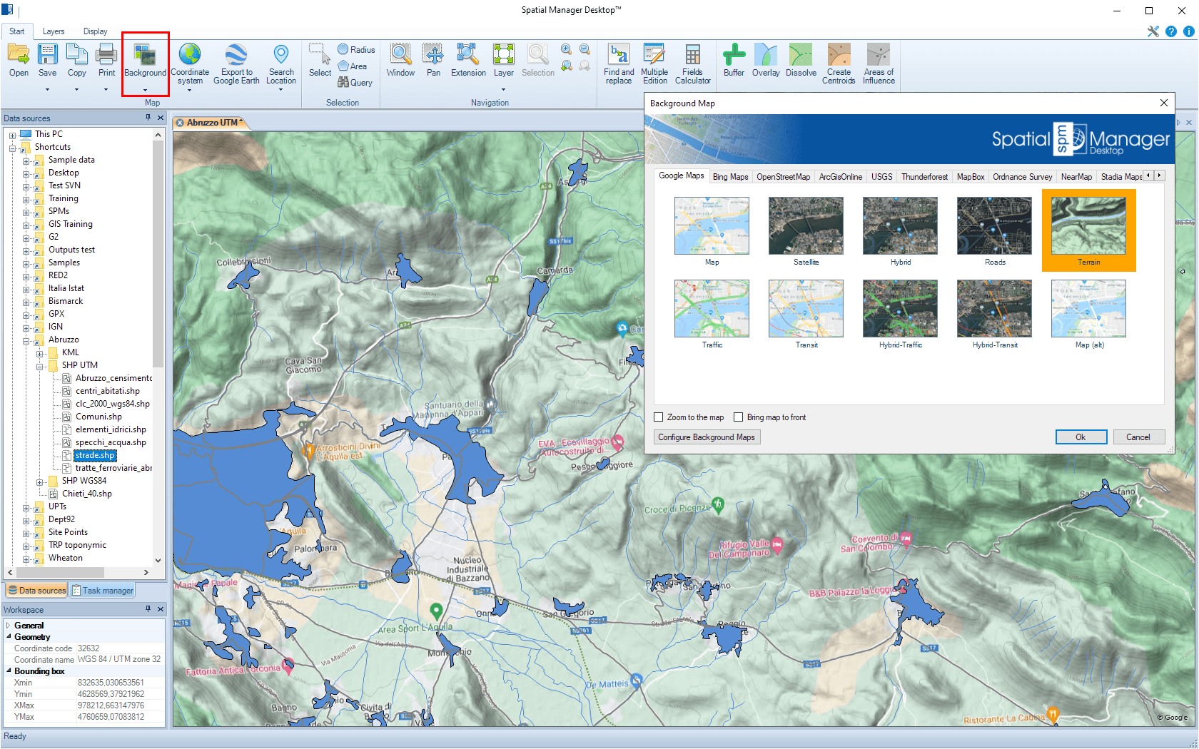 You can select an image map model to show as ‘Background Map’ in the map through the “Start” ribbon of Spatial Manager Desktop. This will open the “Background Map” window, allowing you to select a model from the Maps list. You can find the list arranged using different Groups (Tabs) for the different preset Providers (OpenStreetMap, Mapbox, etc.) and the User groups (see Configure User ‘Background Maps’). The image of the dynamic ‘Background Map’ is automatically adapted to the current map view, and it will be automatically fitted when the map view changes (zoom, pan, etc.).
