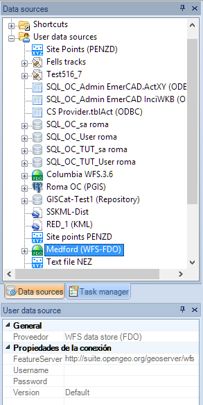 To recognize each different type of spatial data, you will see the different icons used for each data provider in the “Data sources” panel of Spatial Manager Desktop™. In addition, when you select any data source, you will see its properties in the “Properties” panel.