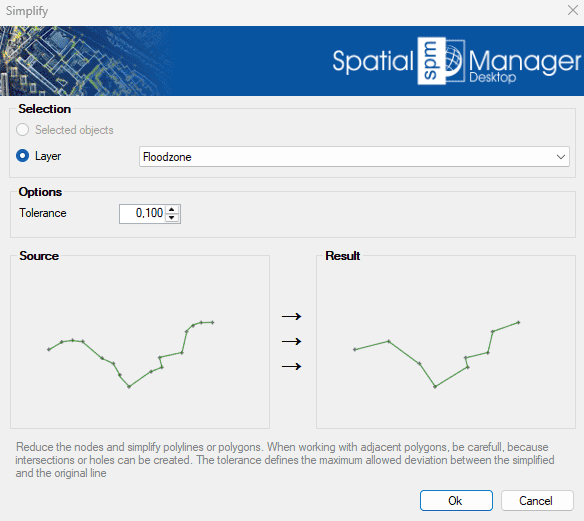 Reduces the number of vertices (nodes) to simplify polylines or polygons, optimizing geometry complexity while maintaining overall shape integrity. This function is useful for improving performance and visualization of spatial data by decreasing detail where appropriate. When working with adjacent polygons, caution is advised as simplification may create unintended intersections or holes. The tolerance parameter controls the maximum allowed deviation between the simplified geometry and the original..