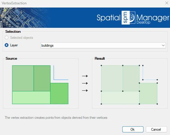 The Vertex Extraction tool generates individual point features from the vertices of existing geometries. This function is useful for analyzing, editing, or exporting key coordinate points that define lines, polylines, or polygons..