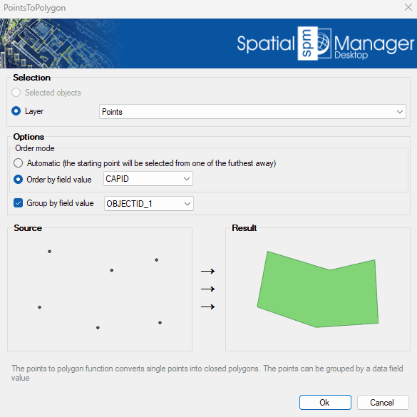 Creates closed polygon geometries by connecting individual points in sequence. This tool is particularly useful when reconstructing area features from boundary points, such as land plots or enclosures. Points can be grouped by a specified data field, enabling the generation of multiple polygons based on categorized point sets..