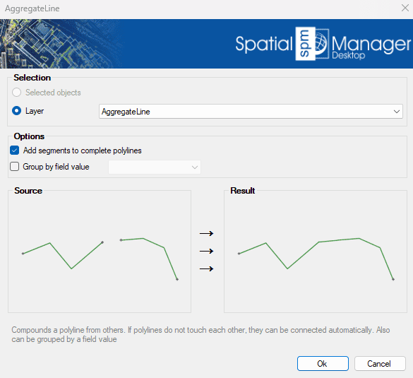 Generates a single polyline by combining multiple existing polylines. When the polylines are not connected, the application can automatically join them based on proximity. Additionally, this process allows grouping and aggregation of polylines according to a specific field value, offering a flexible way to organize and simplify complex line geometries..