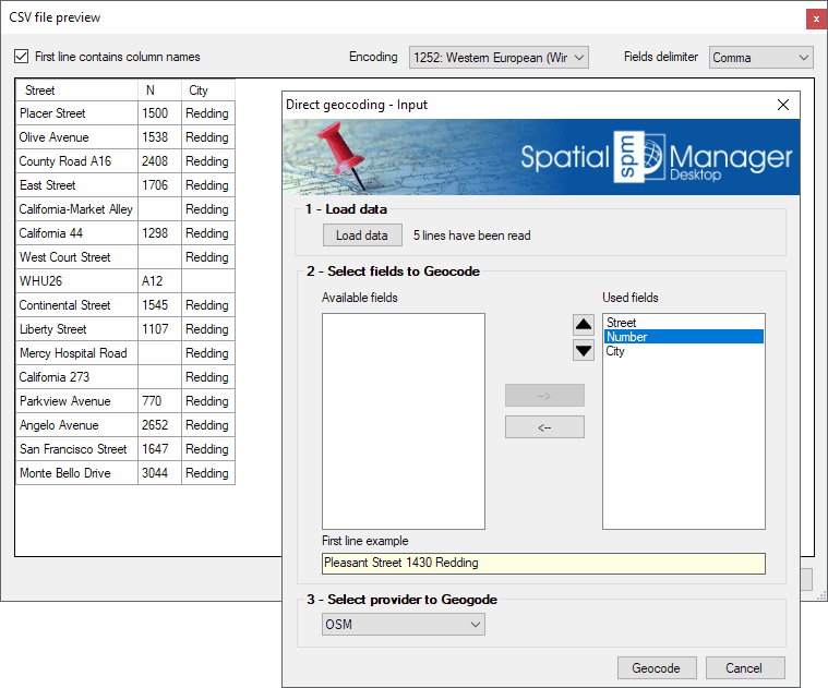 Spatial Manager Desktop™ includes the ‘Direct geocoding’ function that allows you to compose addresses from a geographic data file (CSV, TXT, etc.) and geocode these addresses through a Geocode provider (Google, Bing, OpenStreetMap). Once you load the geographic file, you can preview the resulting table, configure some file parameters (such as the fields delimiter, etc.), select (add or remove) and sort the appropriate fields, and select the provider to geocode from the list.