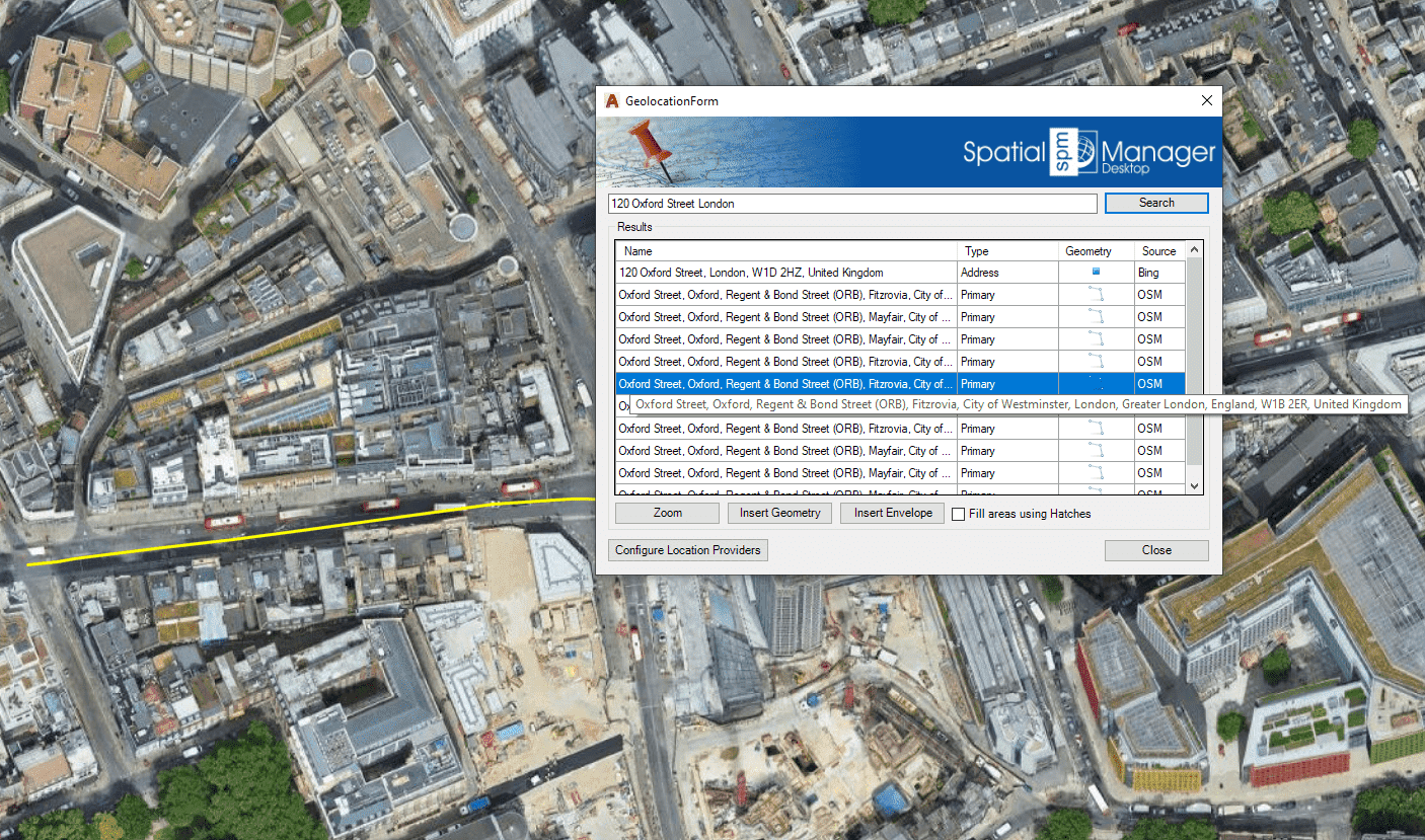 Spatial Manager Desktop™ include functions to geo-locate in your drawing postal addresses, streets, neighborhoods or other geographical objects.
