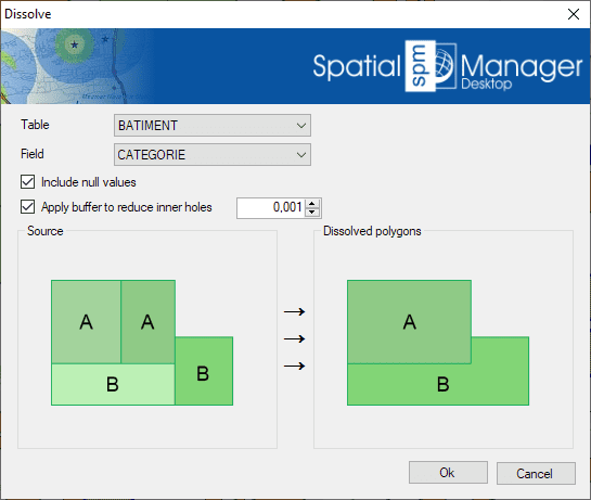 The Dissolve function in Spatial Manager Desktop™ Desktop™ allows you to generate new polygons based on the grouping of other adjacent polygons with some common data.