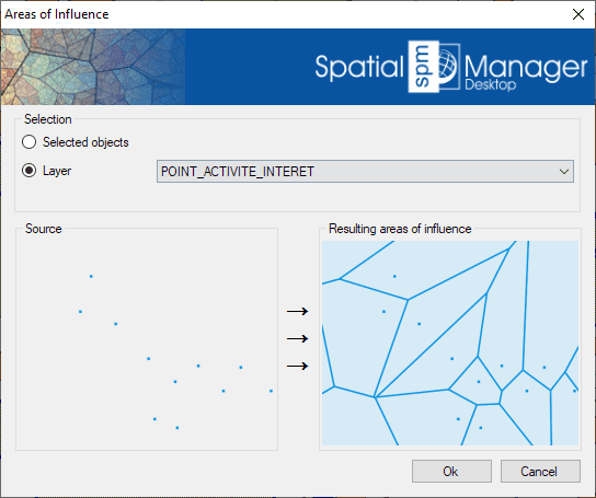 The Areas of Influence function in Spatial Manager Desktop™ Desktop™ allows you to generate, in a new map layer, polygons defined by the set of points closest to each point of a selection of points in the map (Voronoi diagram). Each polygon generated will adopt the same data (if any) as the corresponding point. For example, it would serve to determine which nearby areas are covered by each pharmacy in a municipality and similar scenarios.