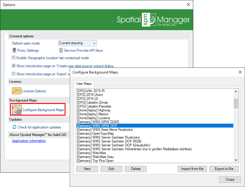 Spatial Manager™ for AutoCAD includes the option to define “User Background Maps” in order to enable access to more Mapping Services (XYZ / TMS, WMTS or WMS).