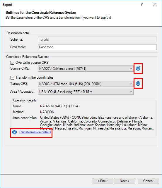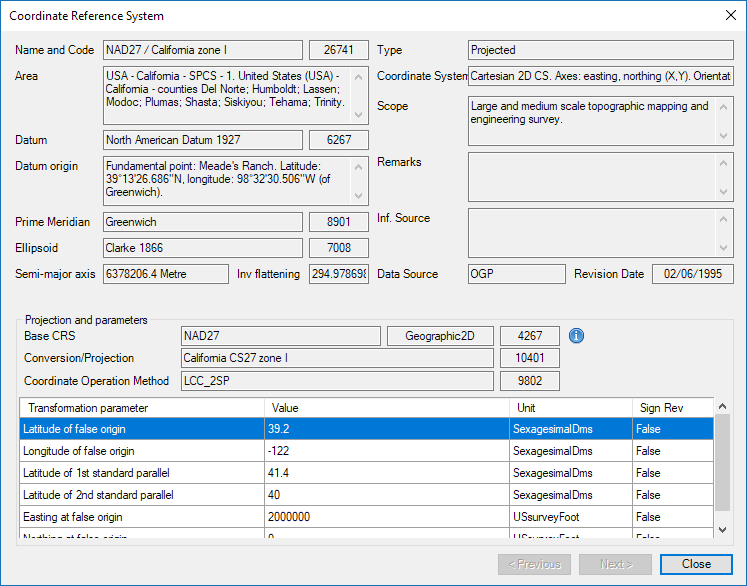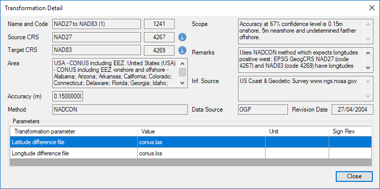 As you will see in several ‘Spatial Manager™ for AutoCAD’ windows, there are some links or buttons to access detailed information about a selected Coordinate System or Transformation process.