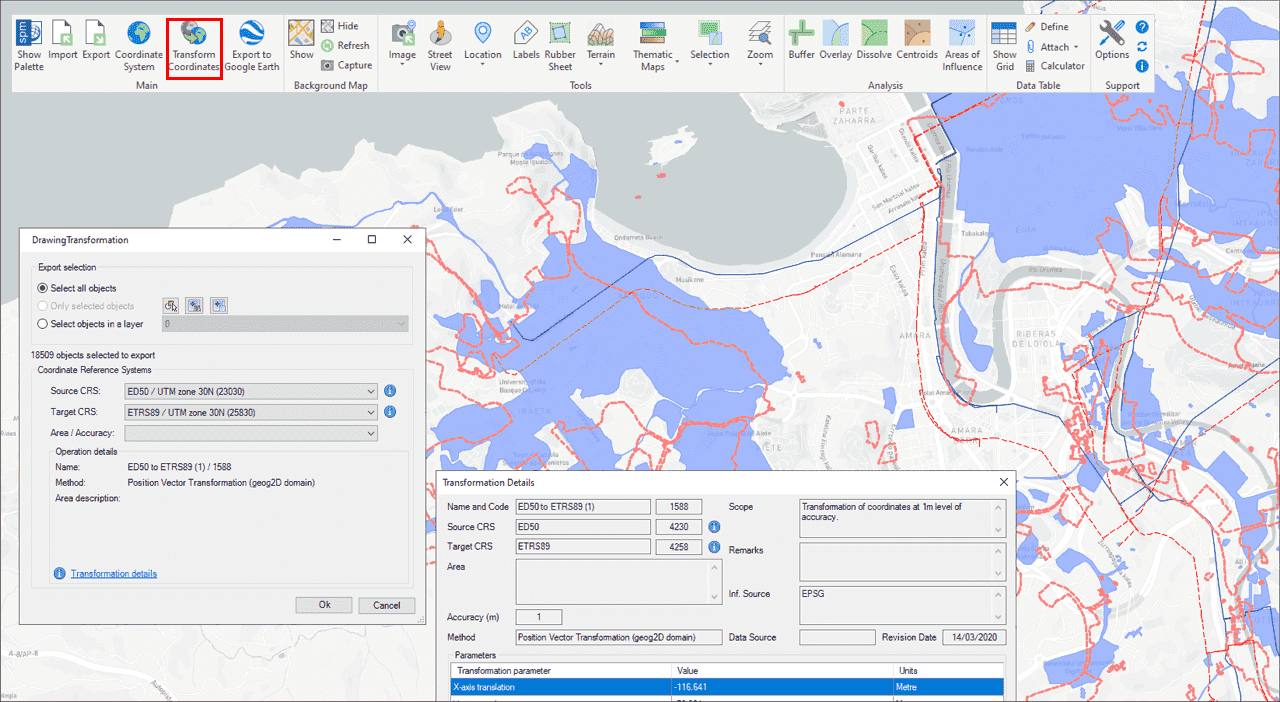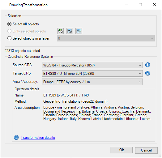 - Operation details: summary of the transformation operation to be processed. Click on Transformation details at the window bottom in order to get detailed information on this process.