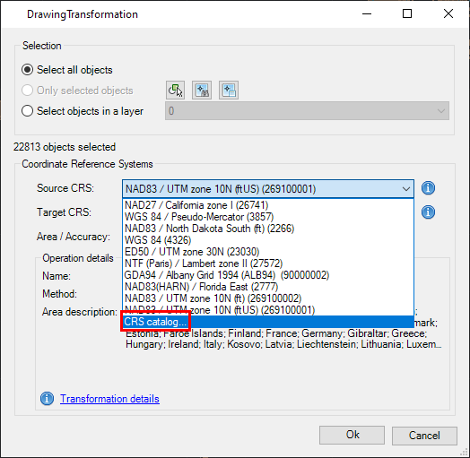 You can choose the appropriate CRSs by clicking on “CRS catalog…” in the CRS dropdown list for the source or for the target data. In the CRS Catalog table you can: