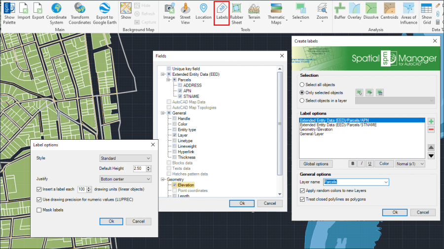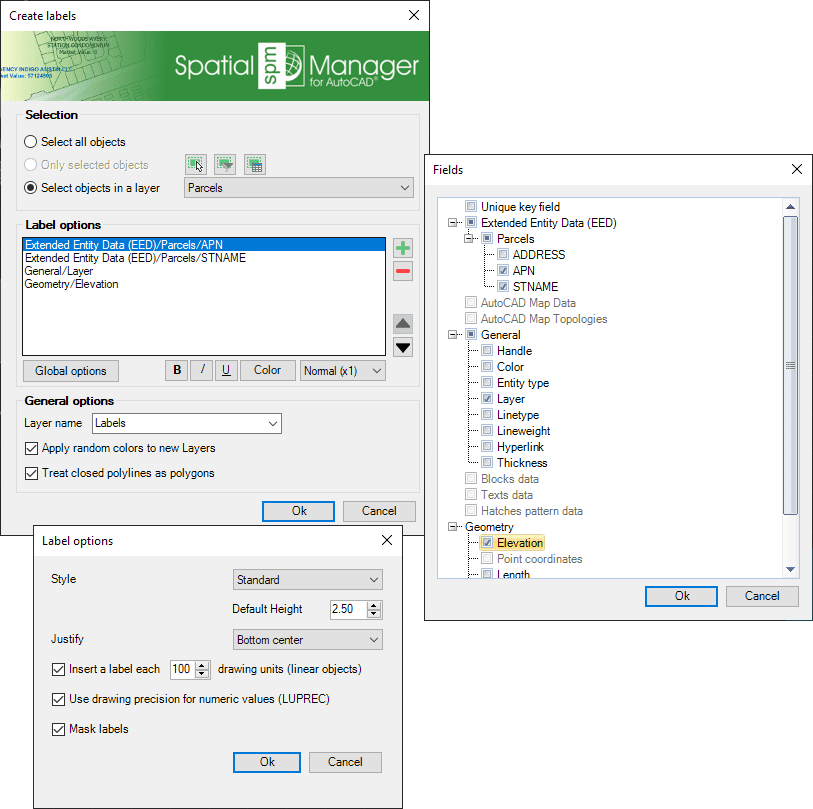 - Label options. You can define the style, height, justification, rotation, and rotation units of the label text objects here. Some of these parameters can be taken from fields in the data tables. For linear objects, you can also specify the separation in drawing units between labels to be repeated along the object, or if you want a single label for each object. As added parameters, you can set the option to use or not LUPREC for decimal places ‘‘(see Notes below)’’ and ‘‘Mask labels’’, which will generate masks (Wipeout objects, grouped with the labels), and they will “trim” the objects located behind the labels in order to improve their reading.