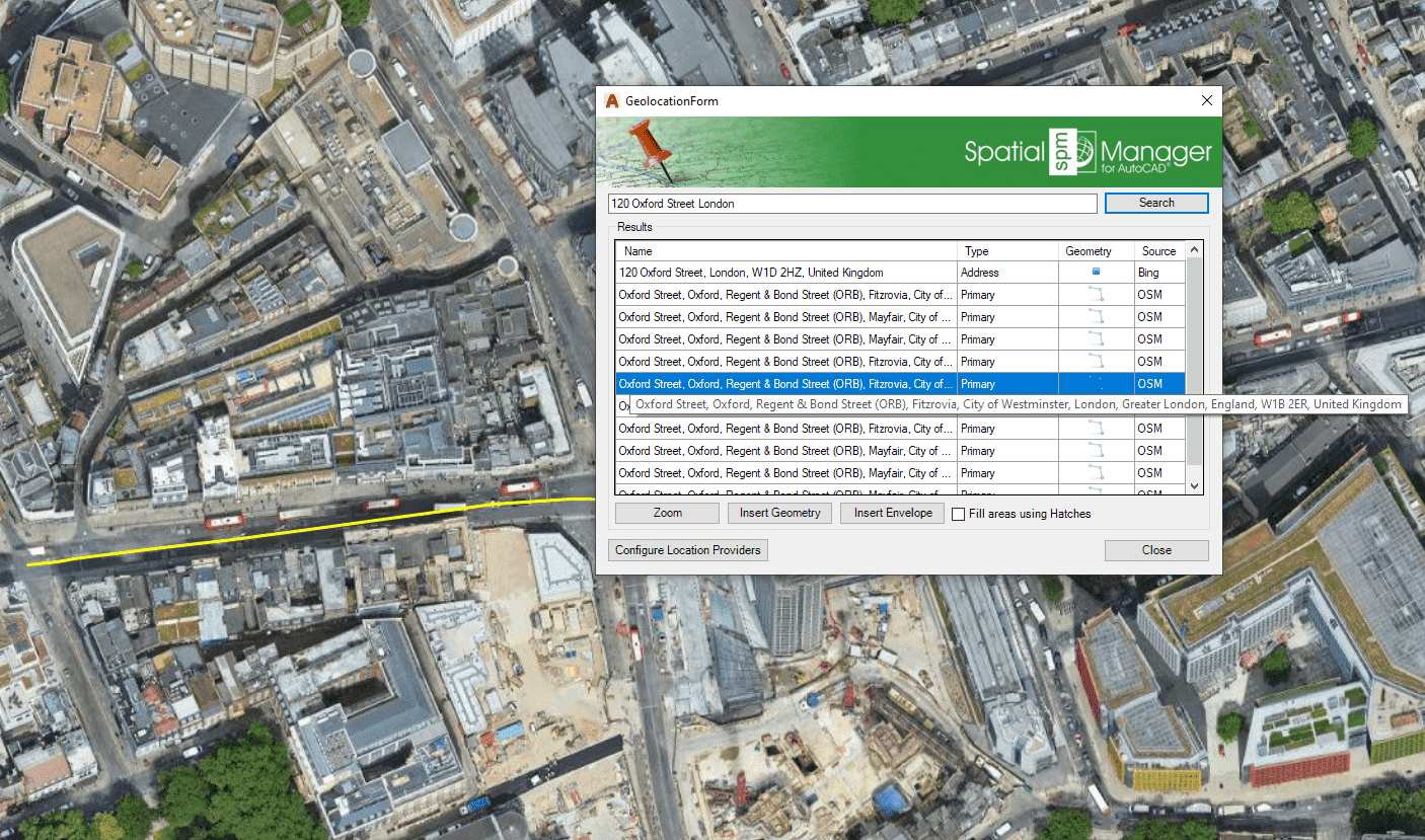 Spatial Manager™ for AutoCAD includes the ‘SPMSEARCHLOCATION’ command that allows you to search for locations through Internet location services based on your search text. Once you enter the search text (the more precise, the more accurate the location) and click “Search” (or press Enter), the results returned by these services (if found, one or more results) will be shown in the search window and include the following information:.