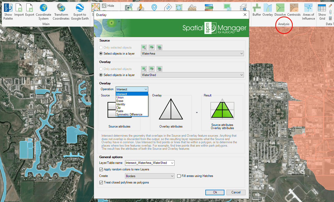 Spatial Manager™ for AutoCAD includes a set of advanced tools designed for geometric and spatial analysis of geographic objects and their geometric relationships, resulting in new objects generated from the resolution of such analysis.