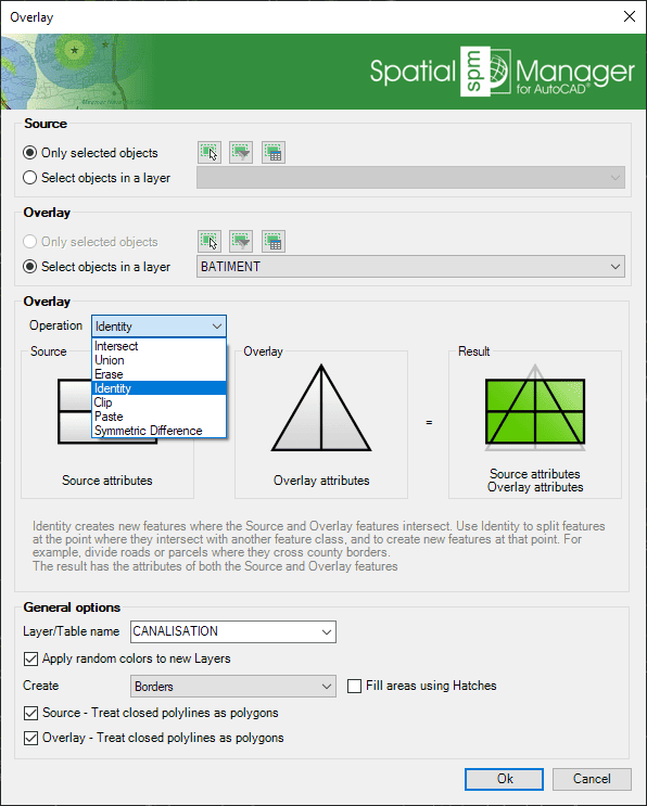 Allows you to create new objects based on geometric and data operations between two existing object groups. These operations are':' Intersect, Union, Erase, Identity, Clip, Paste and Symmetric Difference..