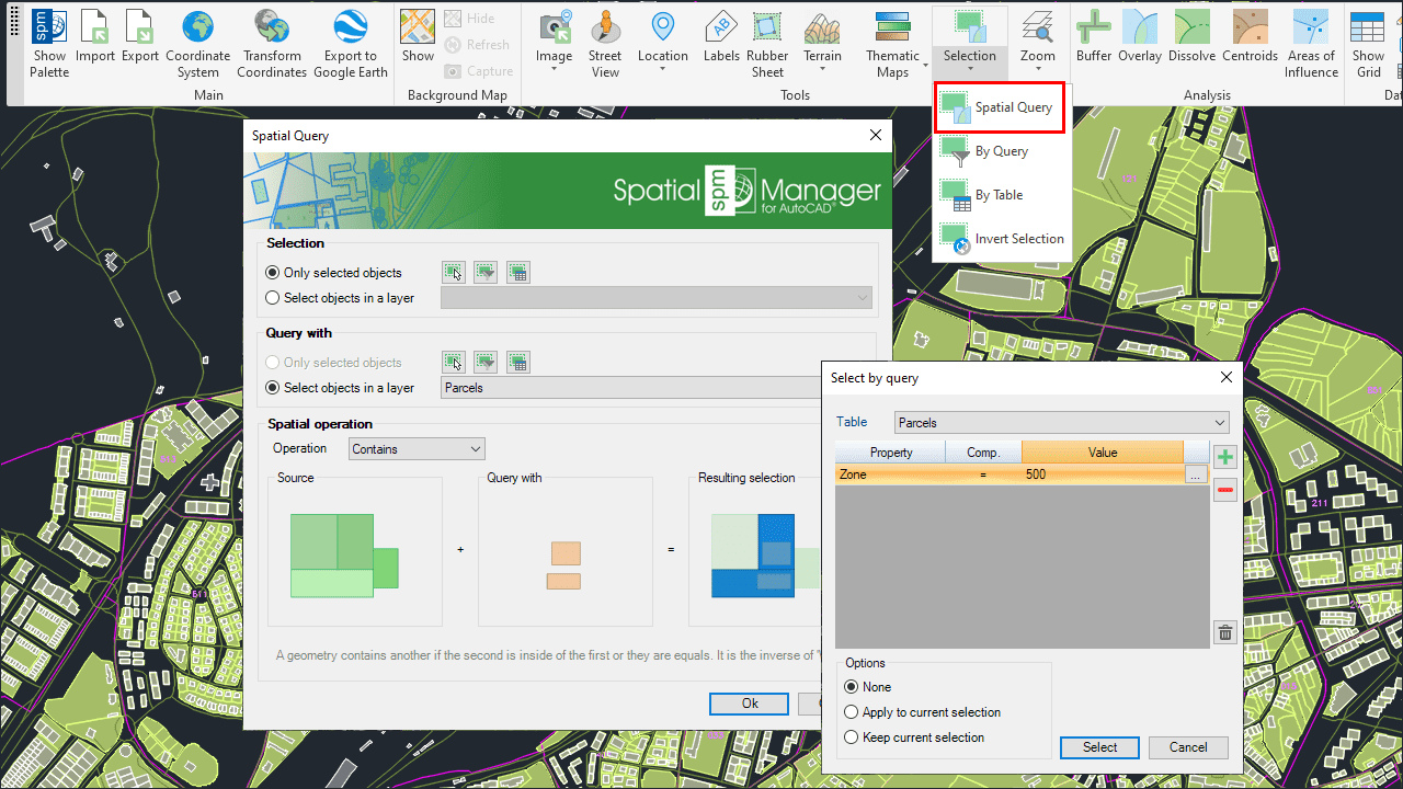 Select objects in the drawing according to the result of advanced simple or compound spatial queries by the following geometric operations..