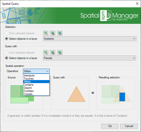 This function allows you to select objects in the drawing by performing geometric operations between two groups of objects: “Selection” (Group 1) and “Query with” (Group 2). For example, according to the chosen parameters in this image, all the hydrants (points) that are located within a parcel (polygons) would be selected.