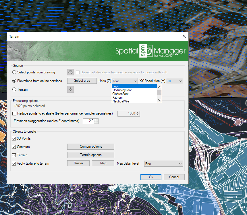 - Select points from drawing. Allows you to select any number of Points or Block References in your drawing in order to create Contours (Polylines) for this point cloud, and/or create one Terrain 3D model for this point cloud (AutoCAD 2010 and upper), and apply (project and fit) a Raster Image or Background Map texture to this Terrain (AutoCAD 2012 and upper). If before executing the SPMTERRAIN command there are already selected Points in the drawing, this option will be adopted by default and the selection set will include all the already selected Points.
