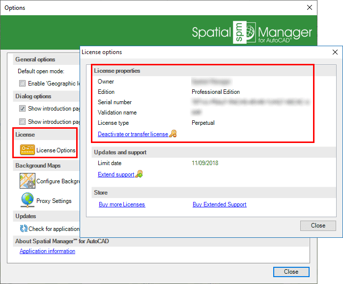 When you purchase one or more licenses of Spatial Manager™ for AutoCAD, you will receive by email your serial number(s) to activate your commercial license(s). After installing the application (if needed), you can activate your license by entering the serial number using the “Activate license” function, which can be found in the “License” section of the application Options (SPMOPTIONS).