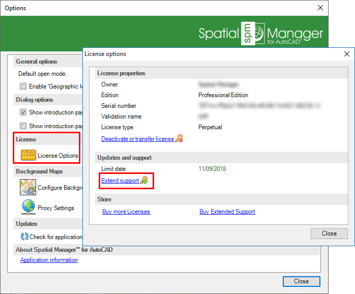 When you purchase one or more support products for Spatial Manager™ for AutoCAD, you will receive a confirmation by email in order to extend the support period for the application. After purchasing the support extension, the new support period will be automatically activated the next time you run the application.