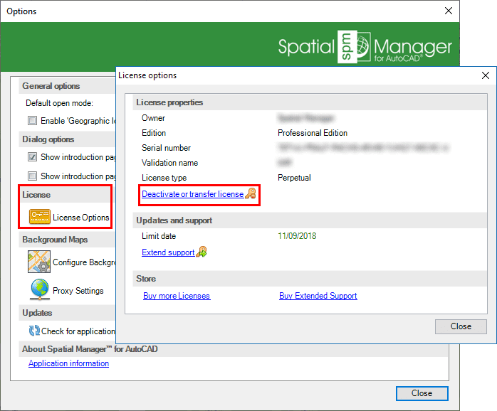 You can deactivate or transfer a license of Spatial Manager™ for AutoCAD by using the “Deactivate or transfer license” function, which can be found in the “License” section of the application options.