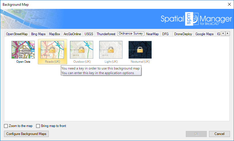 Some Background Map providers require specific usage terms or API keys. Spatial Manager™ for BricsCAD lets you configure these credentials easily, enabling access to restricted maps.