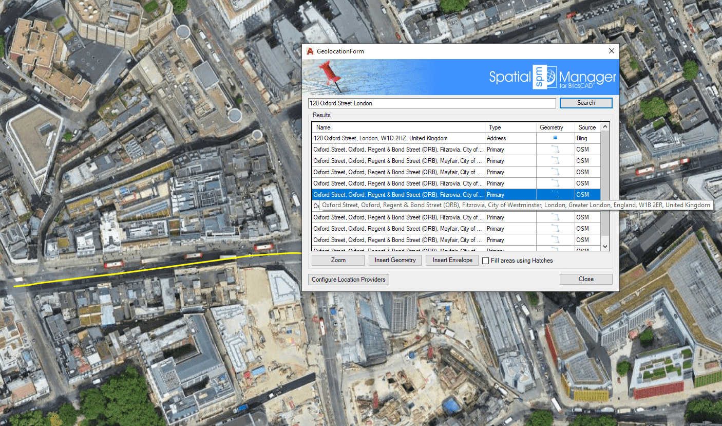 The Spatial Manager™ for BricsCAD ‘Search Location’ window allows you to select any shown result in order to: