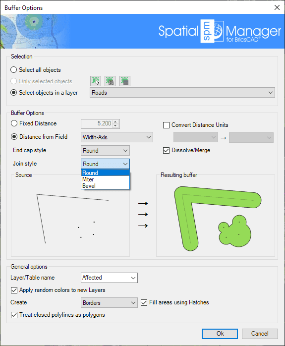 The command ‘SPMBUFFER’ in Spatial Manager™ for BricsCAD allows you to generate buffered polygons around point entities, linear entities, or polygon boundaries. Buffer distance can be constant or taken from the value of a table field for each entity. It is possible to merge the generated entities in their common areas, and different styles of joins and endings can be chosen.