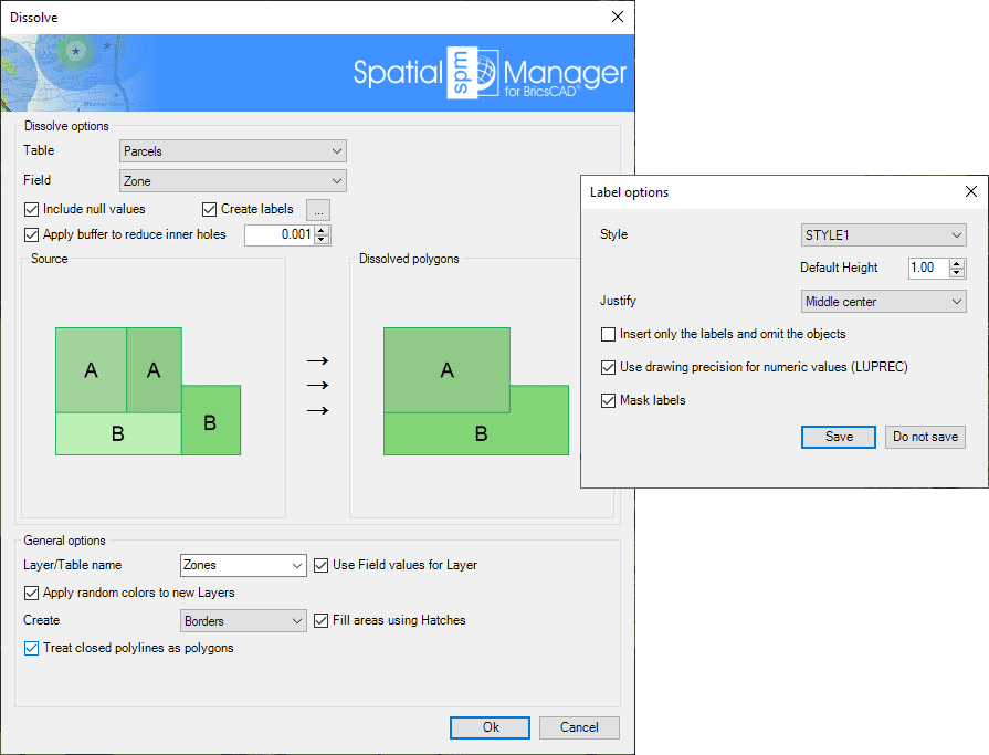 - Create: Dissolved entities type, borders, or polygons. The polygons option allows you to select MPolygons as the type of entity to use (BricsCAD 20 and upper). The MPolygons can be defined by multiple rings, even including holes, as a single BricsCAD entity.