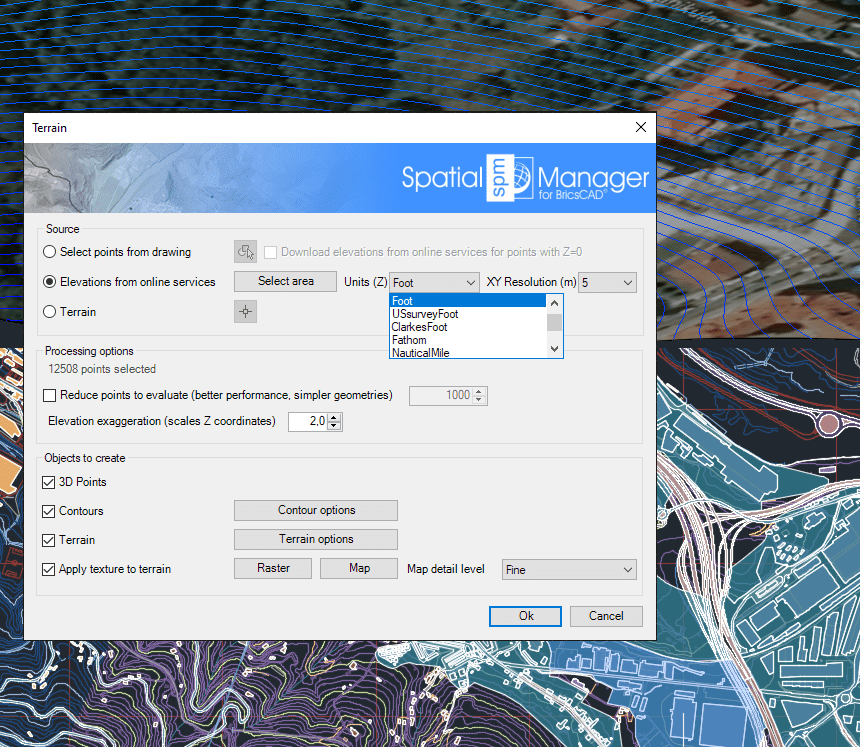 - Elevations from online services. Allows you to define a rectangular area in your drawing for any Earth location in order to create a 3D Points grid from Internet elevation providers in the selected area (Data sources), and/or create Contours (Polylines) for this point cloud, and/or create one Terrain 3D model for this point cloud (BricsCAD 2010 and upper), and apply (project and fit) a Raster Image or Background Map texture to this Terrain (BricsCAD 2012 and upper).