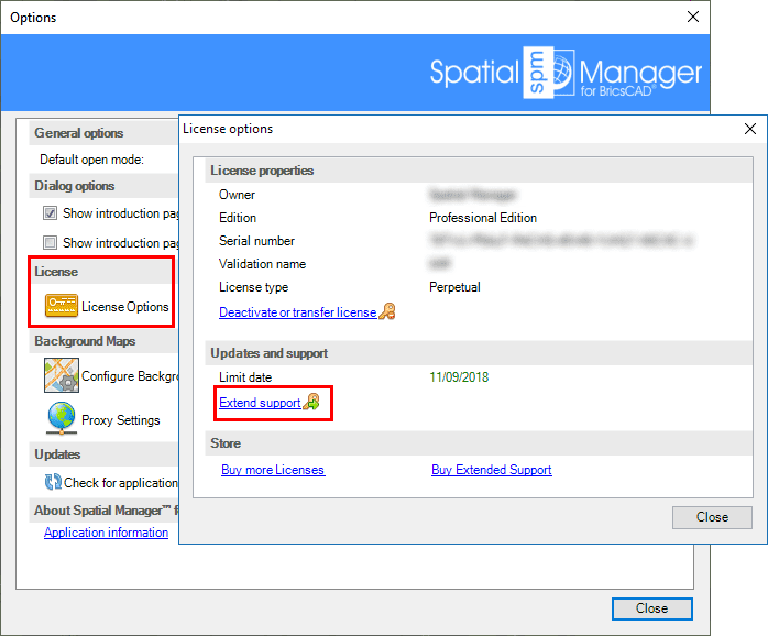 When you purchase one or more support products for Spatial Manager™ for BricsCAD, you will receive a confirmation by email in order to extend the support period for the application. After purchasing the support extension, the new support period will be automatically activated the next time you run the application.
