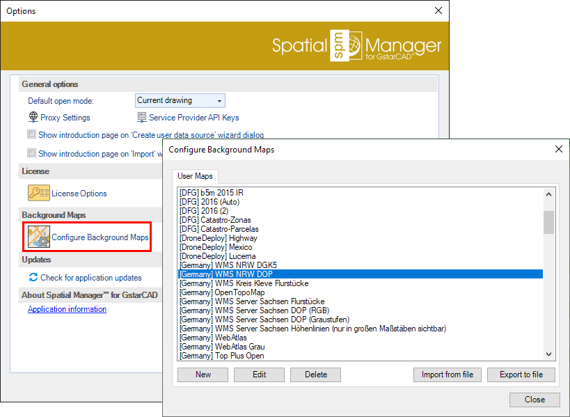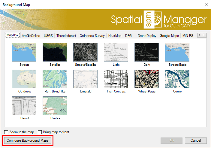 Spatial Manager™ for GstarCAD includes the option to define “User Background Maps” in order to enable access to more Mapping Services (XYZ / TMS, WMTS or WMS).