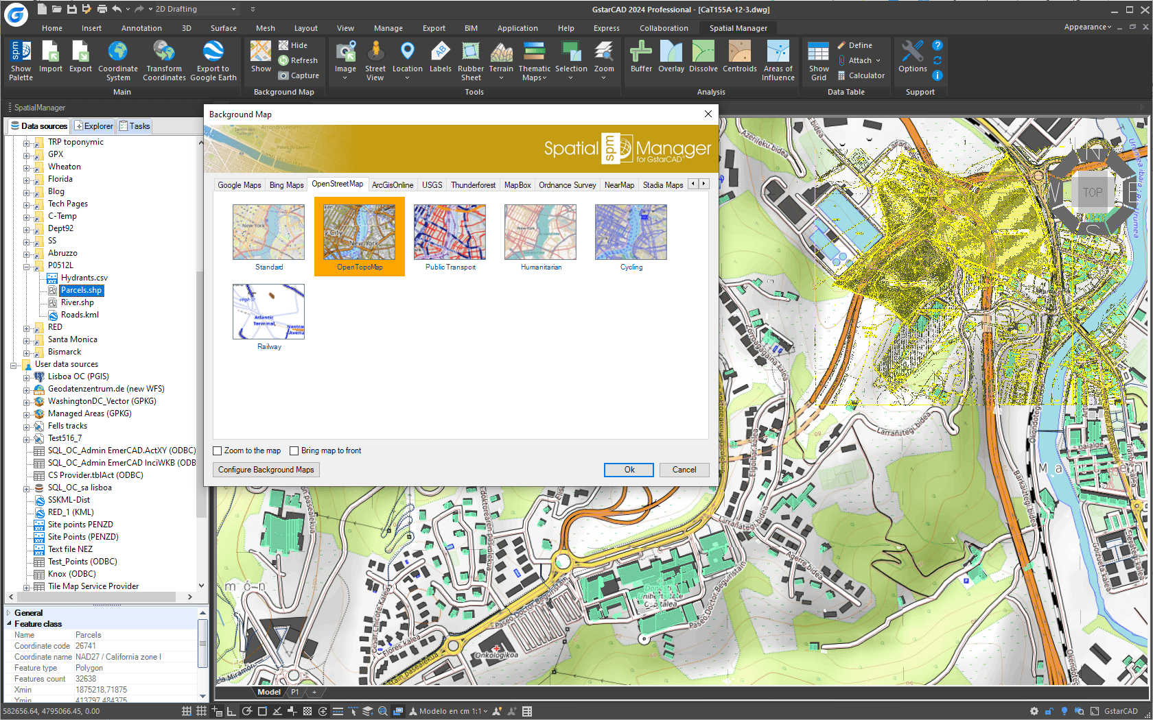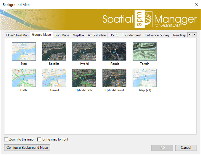 Choose in GstarCAD from among a lot of dynamic Backgrounds Maps from providers such as Google Maps, OpenStreetMap, Bing, MapBox, Ordnance Survey, etc. or configure your own maps.