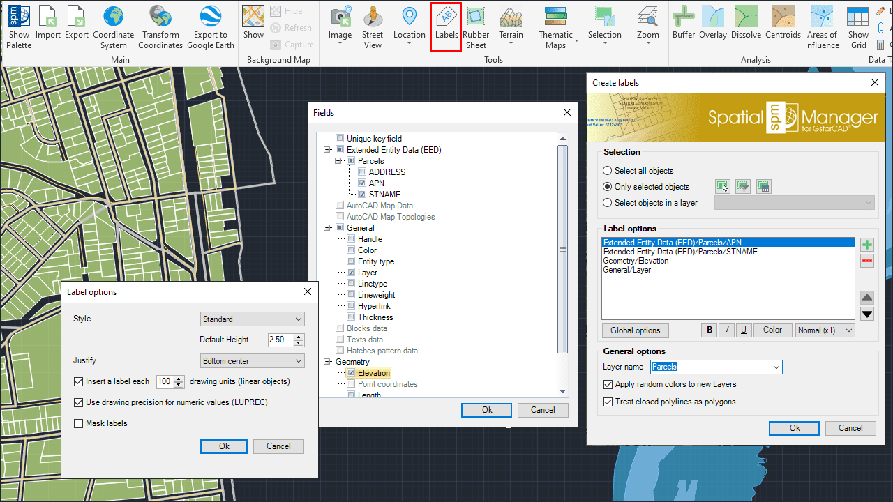 - Label options. You can define the style, height, justification, rotation, and rotation units of the label text entities here. Some of these parameters can be taken from fields in the data tables. For linear entities, you can also specify the separation in drawing units between labels to be repeated along the entity, or if you want a single label for each entity. As added parameters, you can set the option to use or not LUPREC for decimal places ‘‘(see Notes below)’’ and ‘‘Mask labels’’, which will generate masks (Wipeout entities, grouped with the labels), and they will “trim” the entities located behind the labels in order to improve their reading.