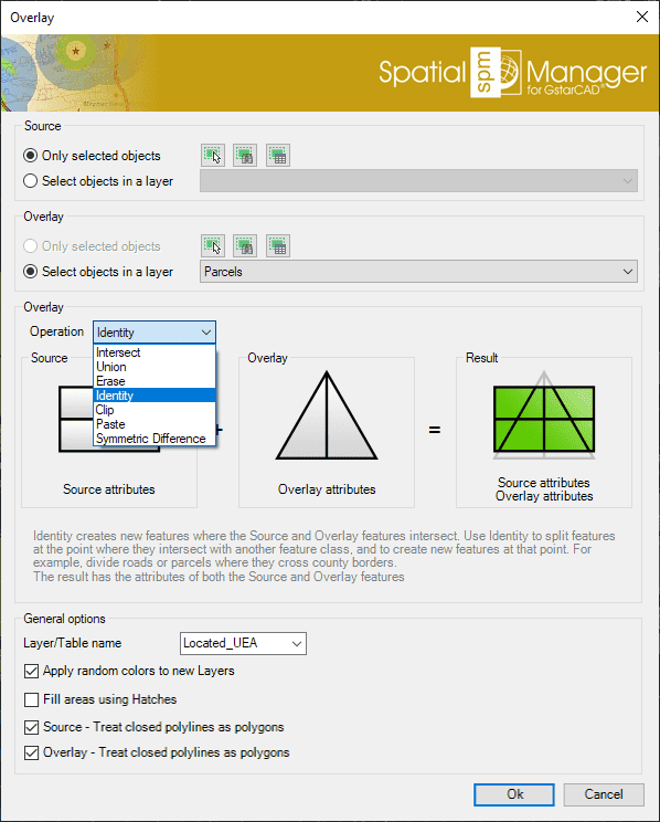 The command ‘SPMOVERLAY’ in Spatial Manager™ for GstarCAD allows you to create new entities based on geometric and data operations between two existing entity groups.