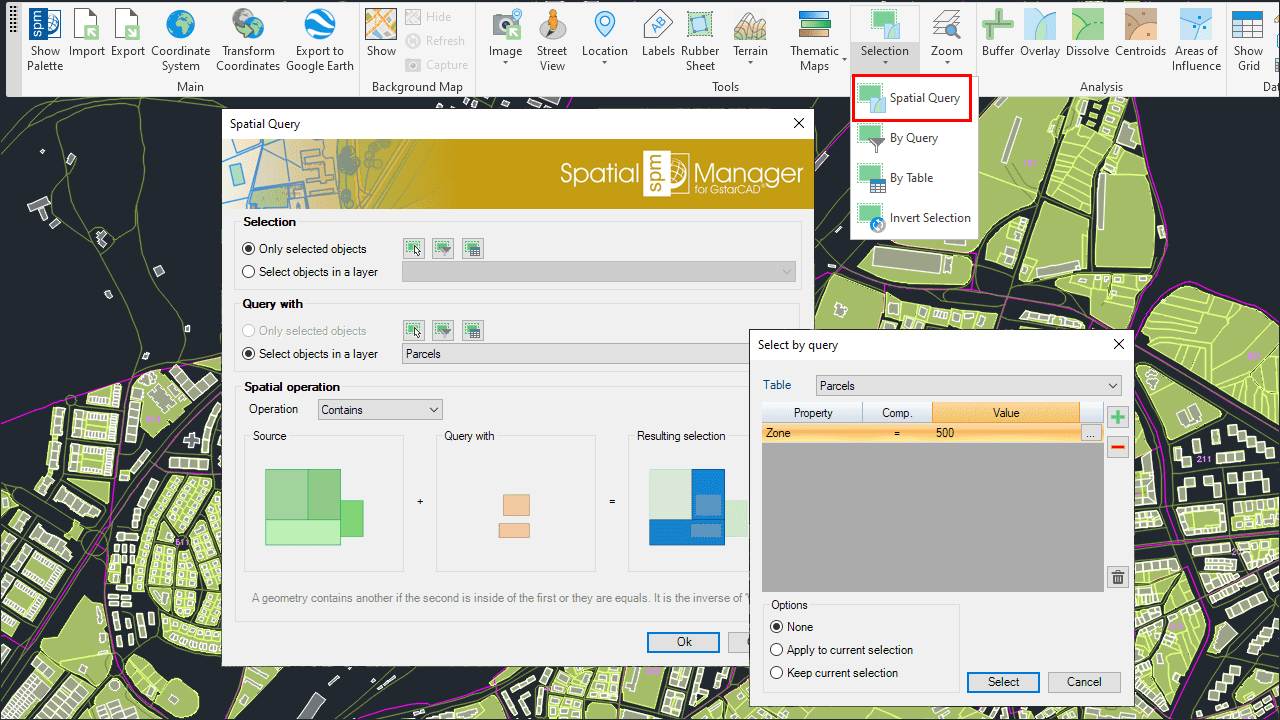 The command ‘SPMSPATIALQUERY’ in Spatial Manager™ for GstarCAD allows you to select entities in the drawing according to the result of advanced simple or compound spatial queries.