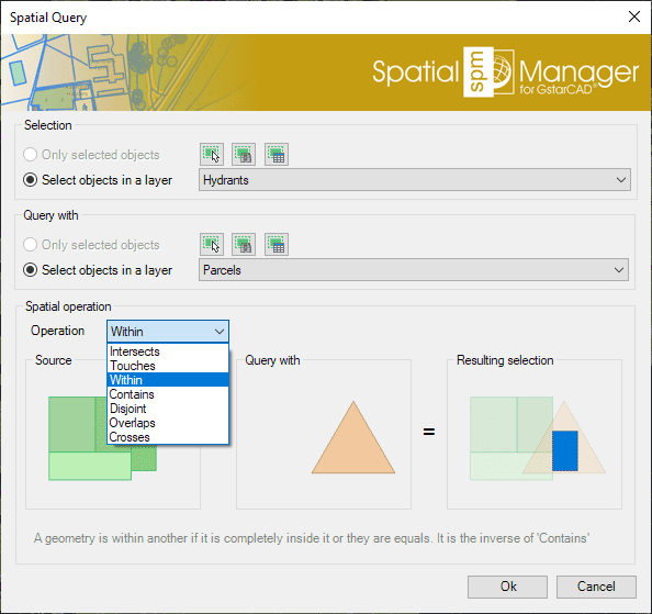Select objects in the drawing according to the result of advanced simple or compound spatial queries by the following geometric operations..