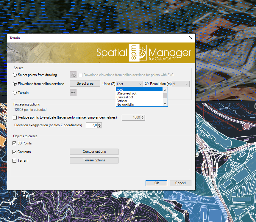 - Elevations from online services. Allows you to define a rectangular area in your drawing for any Earth location in order to create a 3D Points grid from Internet elevation providers in the selected area (Data sources), and/or create Contours (Polylines) for this point cloud, and/or create one Terrain 3D model for this point cloud (GstarCAD 2010 and upper), and apply (project and fit) a Raster Image or Background Map texture to this Terrain (GstarCAD 2012 and upper).