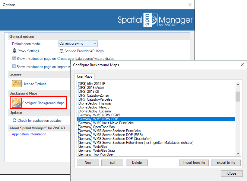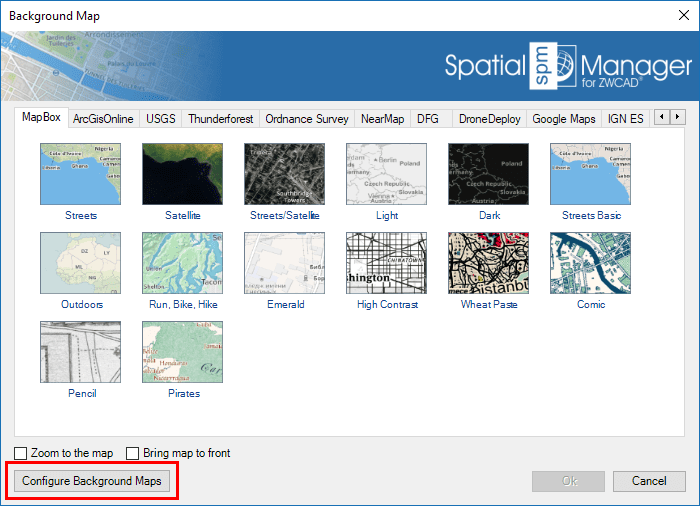 Spatial Manager™ for ZWCAD includes the option to define “User Background Maps” in order to enable access to more Mapping Services (XYZ / TMS, WMTS or WMS).