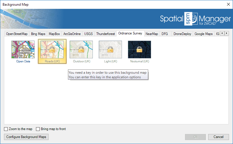 Certain image maps providers included in Spatial Manager™ for ZWCAD may require special terms of use for the users of their maps. You can configure any special setting needed to load the maps of such providers through the Service Provider API Keys in the application Options (‘SPMOPTIONS’). You can also configure and save these settings the first time you try to use (‘SPMBGMAPSHOW’) a ‘Background Map’ that needs a special configuration.