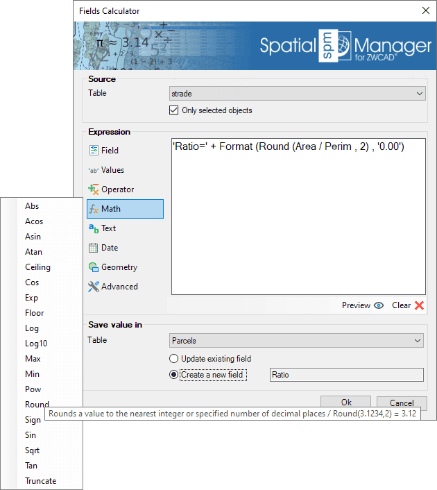 The command ‘SPMDATACALCULATOR’ of Spatial Manager™ for ZWCAD (Fields Calculator) allows you to calculate simple or complex expressions using operators and functions that can be applied to field values in a table and/or to constant values.
