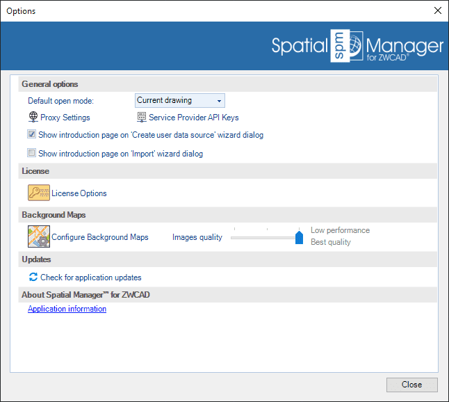 To access spatial databases or data stores in Spatial Manager™ for ZWCAD, you first need to have defined a User Data Source (UDS) including all the parameters to connect to (to learn more about UDSs, see: Data sources page).