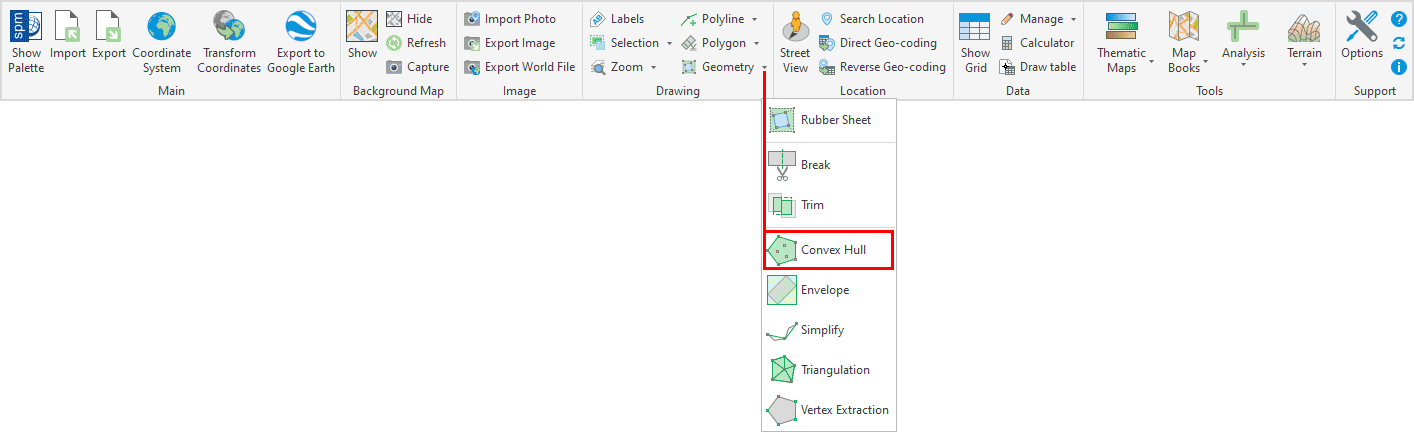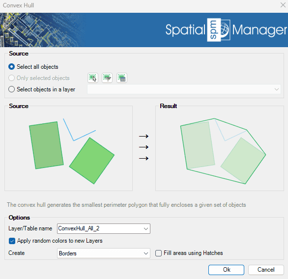The SPMCONVEXHULL command creates the convex hull (convex envelope) of selected entities - the smallest convex polygon that contains all selected features.