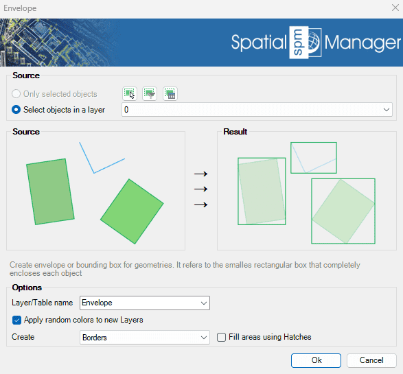 The SPMENVELOPE command creates rectangular polygon entities representing the minimum bounding rectangle (envelope) of selected entities.