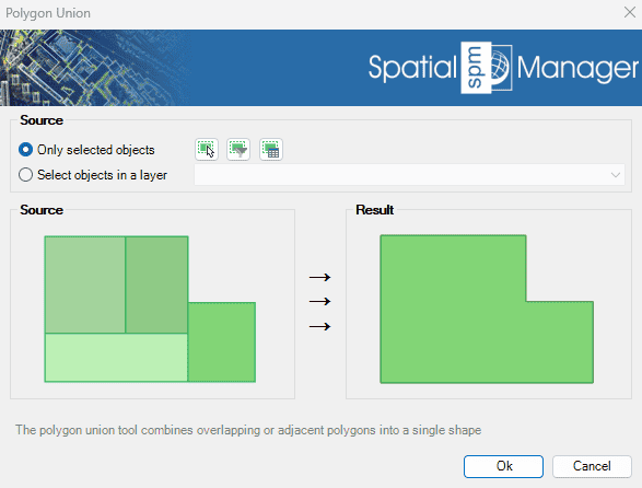 Combines overlapping or adjacent polygons into a single, unified geometry. This tool simplifies complex datasets by removing internal boundaries and merging connected areas. It is essential for consolidating features such as land parcels, administrative zones, or habitat regions, ensuring cleaner and more efficient spatial data..