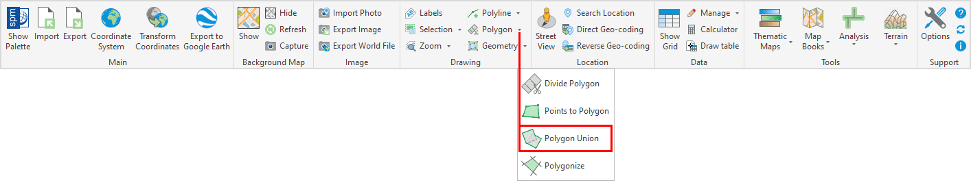 The SPMPOLYGONUNION command merges overlapping or adjacent polygon entities into unified polygons, eliminating internal boundaries.