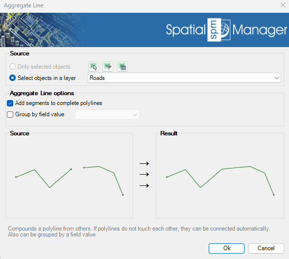 Generates a single polyline by combining multiple existing polylines. When the polylines are not connected, the application can automatically join them based on proximity. Additionally, this process allows grouping and aggregation of polylines according to a specific field value, offering a flexible way to organize and simplify complex line geometries..