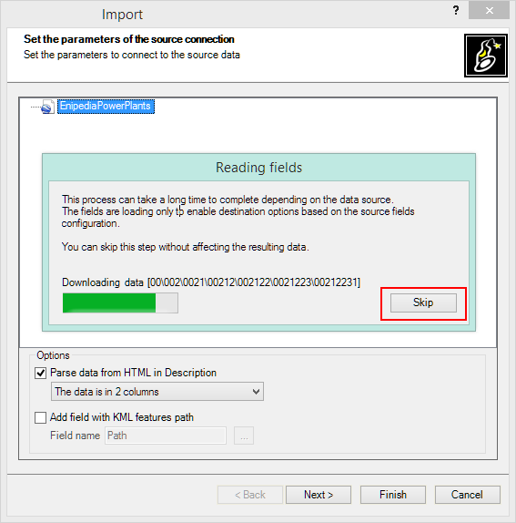 Sometimes, depending on the characteristics of the source, the initial reading of the data Fields may take a long time or even block the importing process. Spatial Manager™ for ZWCAD performs this startup reading to allow you to choose certain options relating to this data on the next wizard window, such as the use of the field values to define the target Layers for the imported entities. However, you have a button available to “Skip” this step, which does not affect the imported entities themselves but only certain options that may not be available in the importing process.