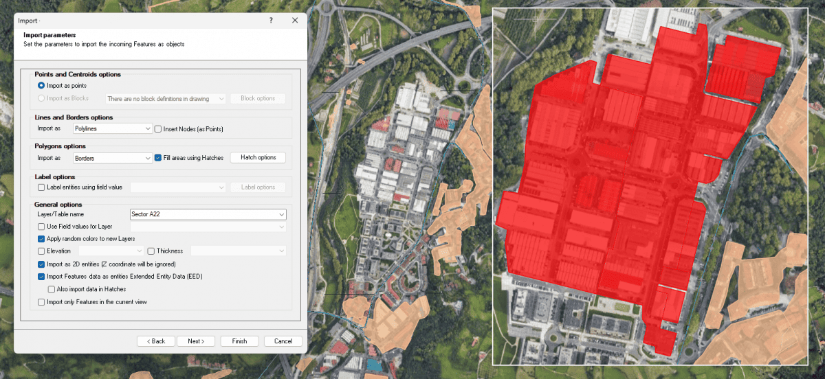 To speed up the process when you are importing, all the “Import” wizard windows in Spatial Manager™ for ZWCAD include the “Finish” button. By pressing this button, you will directly run the import process. The wizard will assume the default values in each step to be omitted.