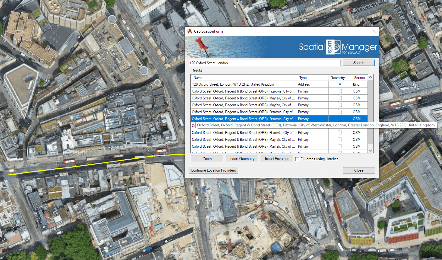 Spatial Manager™ for ZWCAD includes the ‘SPMSEARCHLOCATION’ command that allows you to search for locations through Internet location services based on your search text. Once you enter the search text (the more precise, the more accurate the location) and click “Search” (or press Enter), the results returned by these services (if found, one or more results) will be shown in the search window and include the following information:.