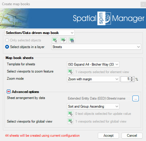 The SPMMAPBOOK command in Spatial Manager™ for ZWCAD automates the generation of map book sheets based on the sheet definitions you’ve created. This command processes all defined sheets and creates individual layouts or drawings for each one.